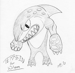 Quick warm up sketch today before the big work. Decided to do a Terrafin from the new Skylanders game. This game is on it's way to being a really big crack addiction for kids and parents as it has the collection aspect like Pokemon for characters and the amazingly smart ability for all character figures to be played across all 3 major game platforms as well as on the PC. Smart marketing and a fun game per my friend Marvin and his son Wilson's review. So for Mr. Wilson a little Terrafin sketch. This guy is a shark with earth based powers, Land Shark peoples!