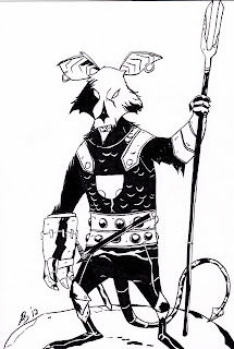 Like a rat from a sinking ship, or a Rat Templar even. Ha! No this is in fact a re-drawing of a page from The Mice Templar with art by the astounding Michael Avon Oeming. Always give credit people. This was just an exercise in fun and practice for inking with my brush pen. I did a rough layout of the pencils from Oemings page in The Mice Templar and than I went straight to my brush pen and just tried to have fun with it. The easiest way to tell that it's not a straight dupe or copy is to look at the ears - after I scanned it in I realized I completely forgot to put any shadow in the right ear, I'm a goof.